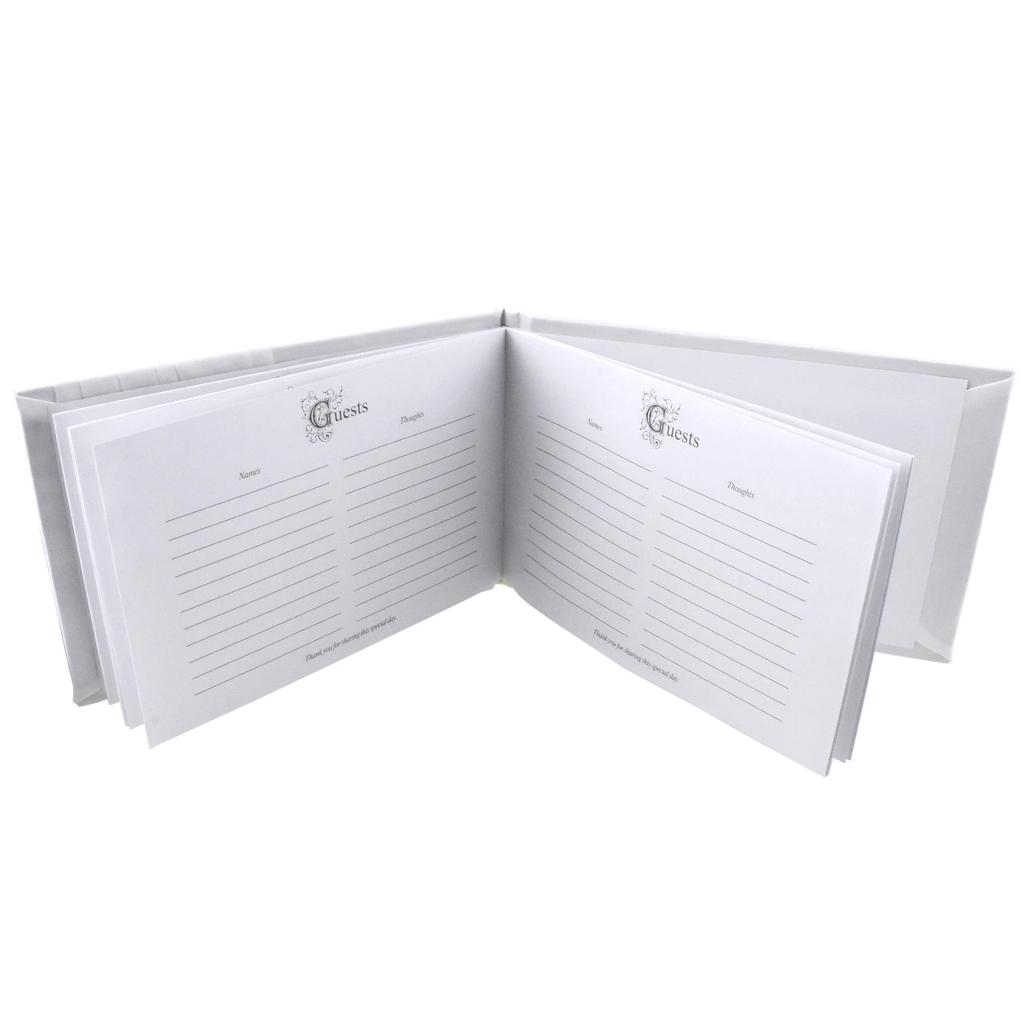 The guestbook features a stunning rhinestone heart on the cover, adding a touch of elegance and glamour. This timeless design complements any wedding theme, making it a perfect keepsake to remember your big day. It contains 46 pages for guests to fill with wishes and heartfelt congratulations. Length: 9" Width: 6.25"
