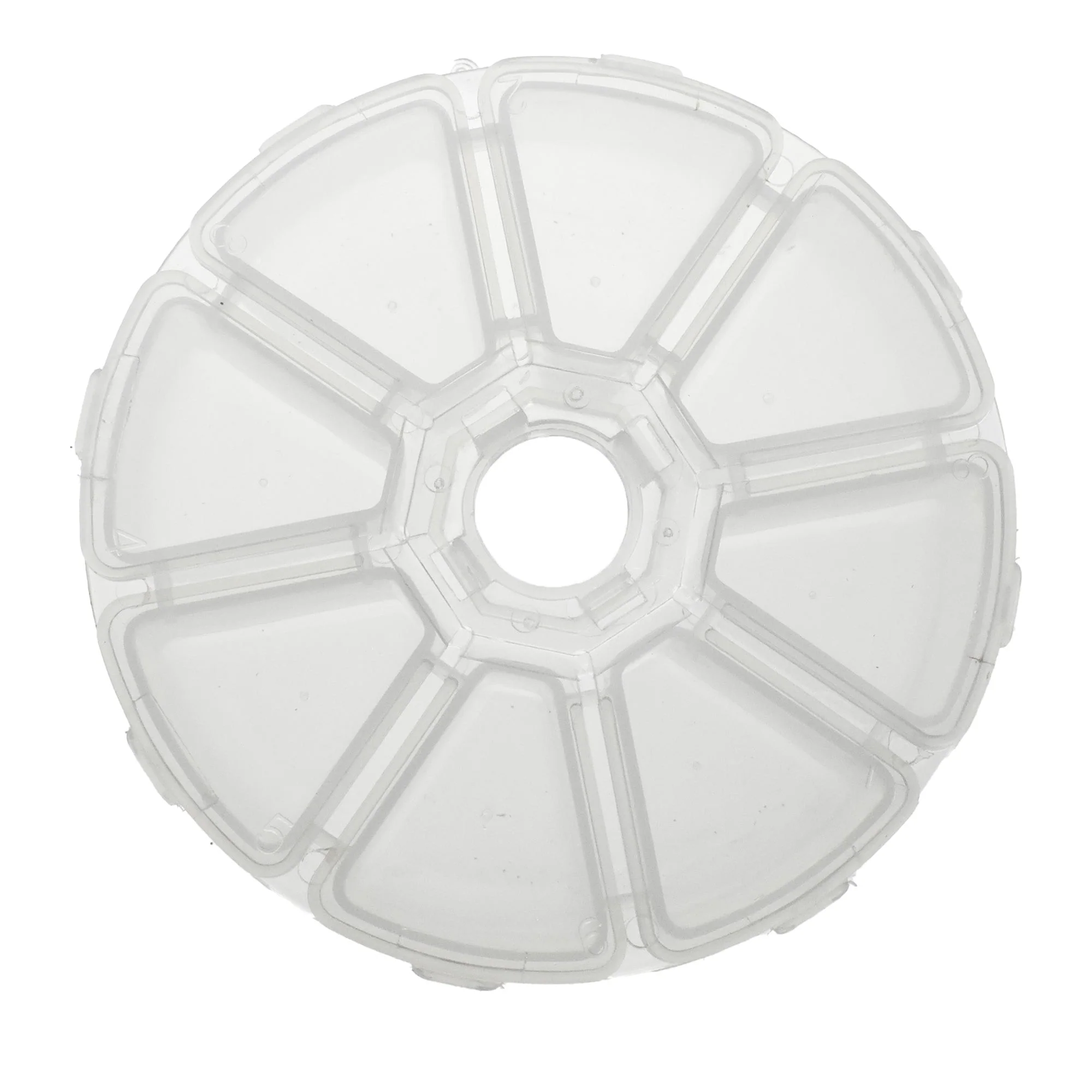 This round box is perfect for any small tools and supplies. The 8 slots give you plenty of room to organize small items, while still being manageable. This plastic craft organizer box is designed to safely and neatly hold your crafting supplies. The compact design makes it ideal for storing small parts, or sorting scraps until you can use them.Length: 4" Width: 4"